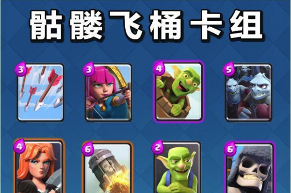 其他的卡牌有骷髅大军,用来骗箭雨。用来防守的哥布林和弓箭手,这里之所以用弓箭手,是因为不会被箭雨直接秒杀。以及自己的箭雨和女武神,来清理敌方空中和地面的大量小生物。