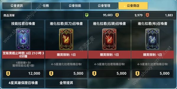 游戏中每周可以获得2只技能拉君,其中一只就是通过12000贡献在公会商店获取的,剩余的贡献可用来购买4-5星进化拉君召唤书,提升狗粮培养速度。是游戏内非常重要的资源获取渠道。