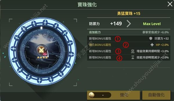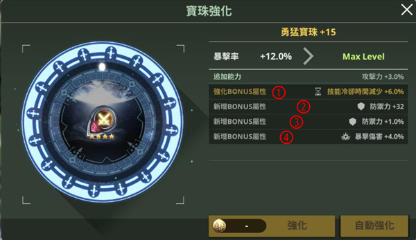 这宝珠有追加能力,强化15的时候加到冷却时间,我要的属性是攻击和冷却时间,洗哪个属性呢?当然最没用的2或者3号属性,将2或者3号的属性洗成3%攻击,因为这强化属性里没有百分比攻击,只是追加能力里有,这样就可以实现6%攻击+6%冷却时间。注意一点就是,当追加能力有你想要属性的时候,强化属性里才能实现两个最大化属性6%+6%,没有追加能力或者追加能力没有想要的,强化属性里就只能一个属性6%+3%,另一个属性3%,当然,这宝珠也可以将2或者3号的属性洗成3%冷却时间,实现6%+3%冷却。(再不明白的话,可以点属性转换,然后点其中一个属性,看右边属性清单,有给看可以洗哪些属性)