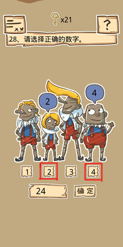 这一关不用想的特别复杂,选项是1、2、3、4,图中人物的头上分别有数字2和4,所以我们只需要点击2和4,然后点击确定即可过关。