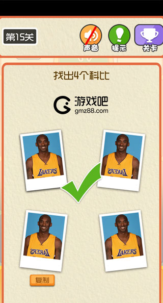 这一关需要注意科比就隐藏在科比中,长按住科比图片,等待几秒就能复制一个科比了。