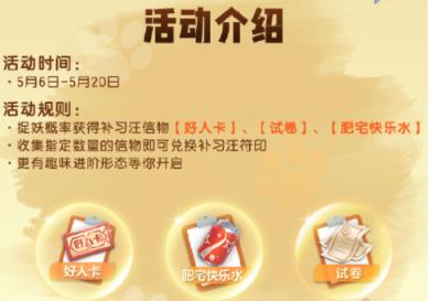 收集指定数量的【肥宅快乐水】、【好人卡】及【试卷】即可兑换汪宝符印,从而唤醒或升级补习汪!也就是说玩家只要在活动期间正常捉妖就能获得补习汪啦!