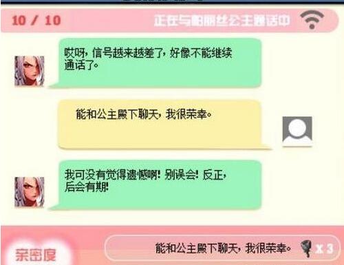 如图所示,个人回答到第10题后和帕丽丝公主的亲密度为88%,然后选择【向TA表白】。此时对话是帕丽丝公主说:“我可没有觉得遗憾啊!别误会!反正,后会有期!”