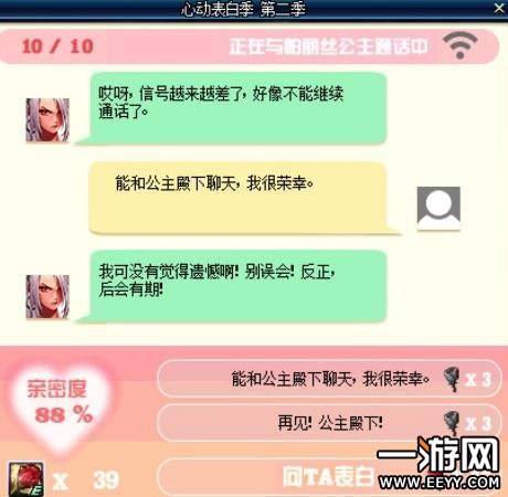 如图所示,个人回答到第10题后和帕丽丝公主的亲密度为88%,然后选择【向TA表白】。此时对话是帕丽丝公主说:"我可没有觉得遗憾啊!别误会!反正,后会有期!"