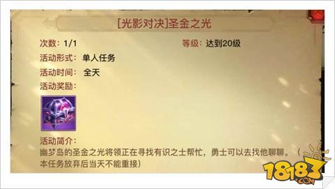 20级可接受光影对决世界事件,获得中量人物天赋经验以及上尉的嘉奖宝箱,宝箱开启获得职业勋章兑换奖励,任务放弃当天不可再接。