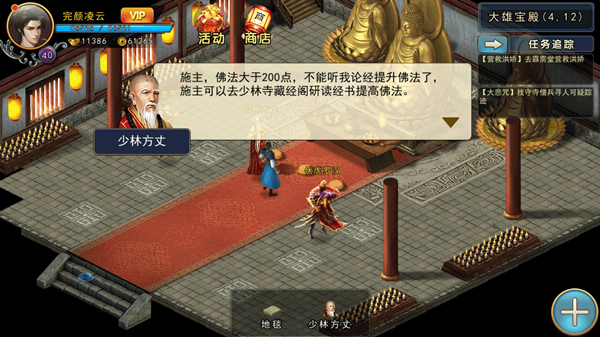 此门派学习可以佛法,首先找少林方丈,需要先讲经,讲经佛法可以学到100,然后找老衲论经提升,每次题目回答正确可以提升5点,答错不扣点数,可以提升到200;然后到藏经阁找扫地僧(5,9)研读楞严咒,可以把佛法提升到250。