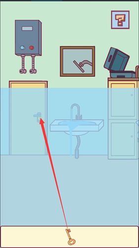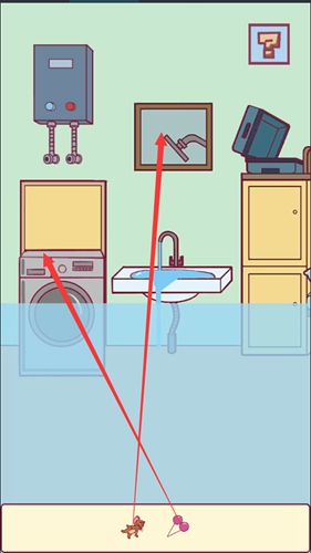 从行李箱中获得杰瑞和气球,把气球绑在左边的洗衣机上,把杰瑞放到浴室的窗口里,获得钥匙,用钥匙将浴室门打开。