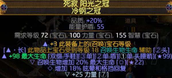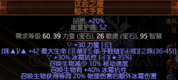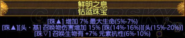 天赋里的珠宝7个,最大生命(一定7%,不然后面生命达不到6000),召唤生物伤害,其他的如果抗性没满就补抗,其他的召唤生物抗性,召唤生物生命都可以,为了提高幻化守卫的生存