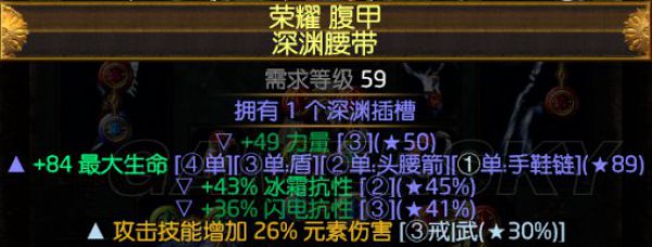 深渊腰带,如果有召唤生物生命最好,没有也行,最大生命,力量最好有,这样生命就可以堆的很高,其他补抗就行