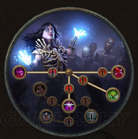 最上面的灵体点不需要了,因为这个BD灵体只是为了得球,两个就够了,右边双闪点了,增加人物生存,其他尽量多珠宝和生命就可以了,左边的召唤生物的天赋点上,秒回很重要,关系到我们的幻化守卫硬不硬,不明白的先直接抄这个天赋就可以了,我测试了很久了,没问题