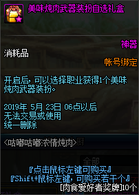 DNF最近推出了美味炖肉武器装扮礼盒,礼盒中可以开出美味炖肉武器装扮,很多玩家都想知道DNF美味炖肉武器装扮怎么获得,下面小编就给大家带来DNF美味炖肉武器装扮获得方法,一起来看看吧!