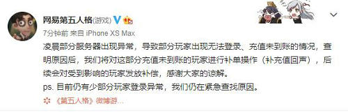 凌晨部分服务器出现异常,导致部分玩家出现无法登录、充值未到账的情况,查明原因后,我们将对这部分充值未到账的玩家进行补单操作(补充值回声),会对受到影响的玩家发放补偿,感谢大家的谅解。