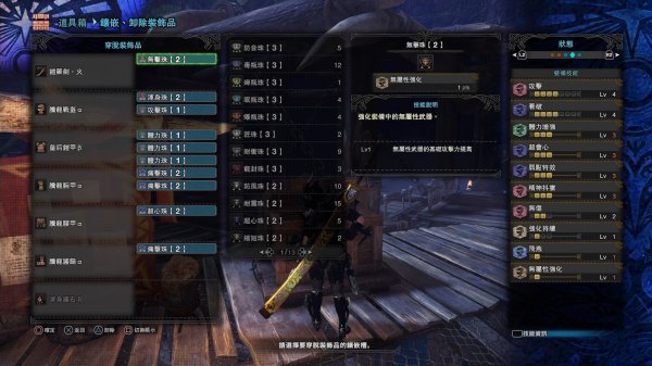 太刀的武器选择现时主流为无属性的“铠罗剑‧火”,无需匠就有白斩而且还有3洞,配上4件腾龙、谷高会心及无击珠,能长期保持白斩及高攻击力,基本上是万用又强力的选择。如果没有“铠罗剑‧火”,较旧代的“天上天下无双刀”也能作下位互换。技能方面建议配无属性强化、看破、攻击、体力增强、精神抖擞、弱点特效。