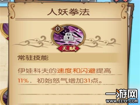 人妖拳法:伊万科夫的速度和闪避提高11%(初始),初始怒气增加31点。