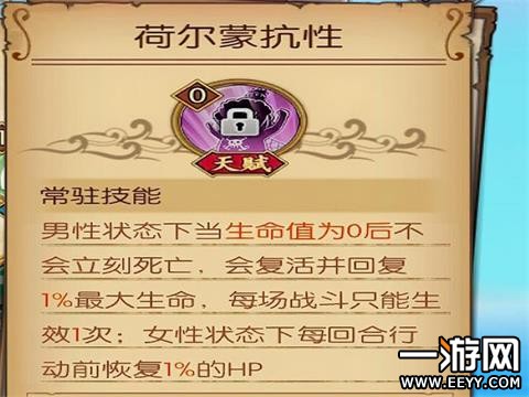 荷尔蒙抗性:男性状态下当生命值为0后不会立刻死亡,会复活并恢复1%最大生命,每场战斗只能生效1次;女性状态下每回合行动前恢复1%的HP。