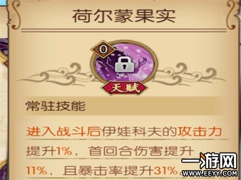 荷尔蒙果实:进入战斗后伊万科夫的攻击力提升1%,首回合伤害提升11%,且暴击提升31%