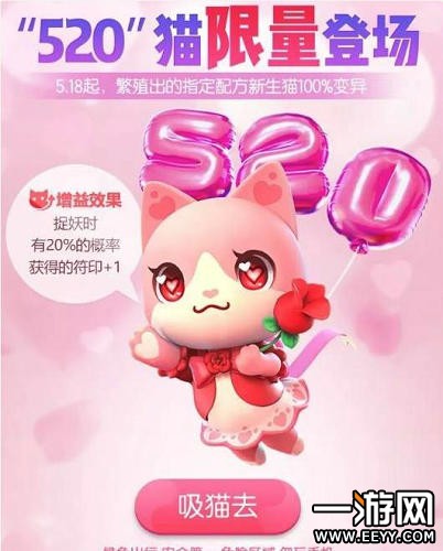 2. 520 主题全新套装猫"以爱之名"即将上架,活动限量 20520 只,可以为御灵师带来捉妖时20%的概率获得符印+ 1 的超强增益效果。
