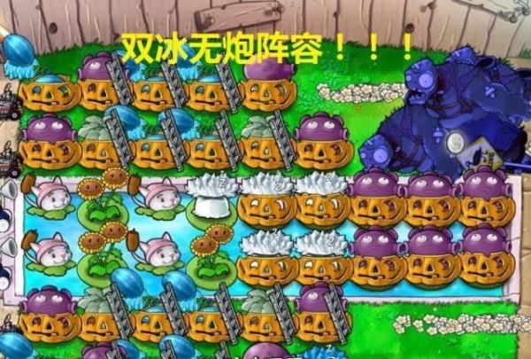 下方的经典阵容想必大家都有所过,依然利用冰西瓜起到减速效果,让玉米加农炮有充足的时间去准备,再给僵尸致命一击。并且,在植物的后方还有忧郁喷菇与莴苣,无论是蹦极僵尸还是小鬼僵尸的突然袭击,都可以有效击杀。