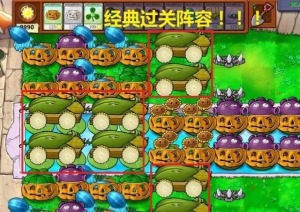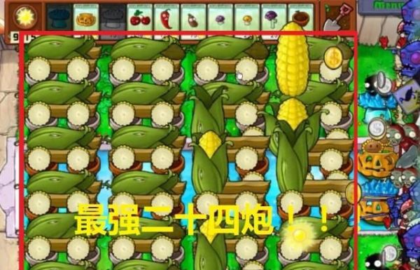 如果上方的十六炮阵容就已经足够强了,那二十四炮的玉米加农炮会让你目瞪口呆。甚至你的双手根本无法解放,所要做的就是点击玉米加农炮再点击僵尸。有没有觉得僵尸突然变成了弱势全体,不知道制作这么多的玉米加农炮需要花费多少点阳光。注:需要注意小鬼袭击。