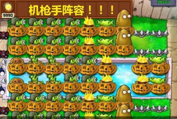 如果你是《植物大战僵尸》“无尽模式”大佬级别的玩家,看到下方的阵容就知道一定是不行的。可作为新手玩家的你们一定认为这是最强的过关阵容,满配的机枪射手再加上火炬树桩,从外表来看无懈可击,可巨人僵尸一拳一个小朋友。