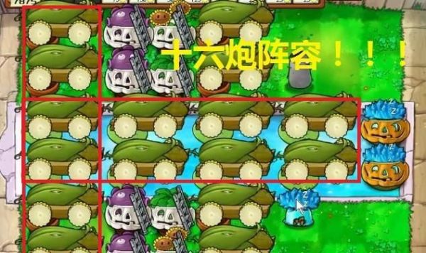 玉米加农炮可以说是《植物大战僵尸》中伤害最高的植物,有玩家便研究出十六炮阵容玩法。将玉米加农炮依次排列,再用莴苣与忧郁喷菇进行配合,达到完美的效果。如果你还不放心,可以再加上几个冰刺菇,用来帮助玉米加农炮更好的冷却回复,强!