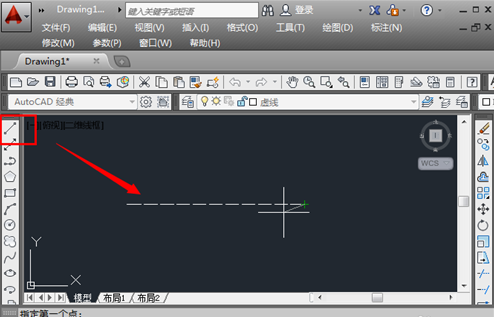 1、返回到绘图界面,选择“虚线”这个图层,然后点击“直线”绘图命令,绘制一条线条就是虚线。