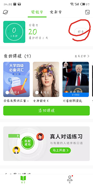 1、点击打开英语流利说app,点击上方的“打卡”。