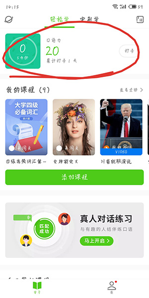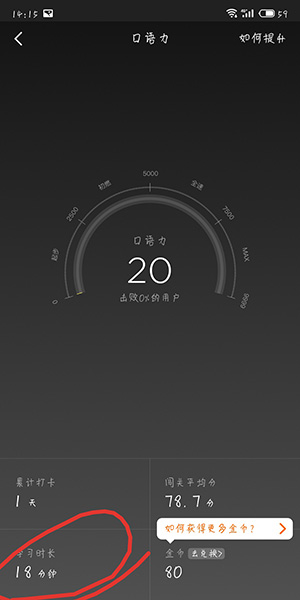 2、这样我们就可以在“口语力”中查看我们的“学习时长”了~