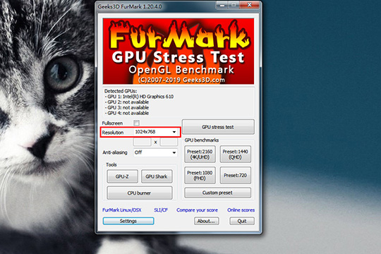 3、接着将会弹出FurMark软件的界面,红框标注内的数值表示在测试时的分辨率,如果你的电脑性能不是很好,最好设置为800×600进行设置,至于其他的设置如果不知道怎么更改,则默认不做更改,如果你想要在软件中调整设置更加精准的数值,也可以在上一步点击其中的“查看使用方法”进行查看,如下图所示: