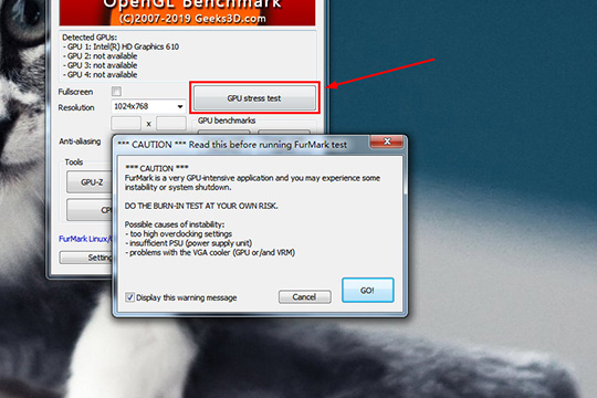 4、全部设置完成后,点击“GPU stress test”选项开始设置,点击“GO”之后就可以开始期待已久的烤机测试了,如下图所示:
