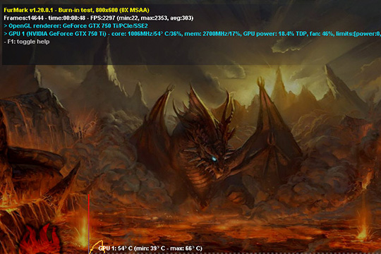 5、在烤机时,最上角将会出现各个数值,由于每个显卡的性能都有差异,所以在烤机时的温度也会有所变化,基本上只需要测试十到十五分钟即可,如果烤机时间太久可能会导致硬件温度过高造成损耗的结果,如下图所示:
