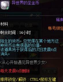 对于DNF异世界的圣金币作用,目前是这样的,玩家过关地下城后,修理NPC会变成雷姆,和雷姆对话可以看到出售三种道具,【雷姆亲手做的三明治】、【蛋黄酱蒸土豆】、【蛋黄酱烤地瓜】,每个道具都可以用【异世界的圣金币】来购买,花费是5个,也就是说一天最多可以购买到3个雷姆出售的道具。这些雷姆出售的道具用于活动【从心开始遇见异世界少女】。