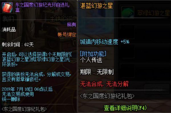 光环自选礼盒,账号绑定。打开可以在湛蓝幻游之星或者是翡翠幻游之星两个光环中自选一个,不过这一个光环属性也没有什么特别的,就是一个城镇移动速度+5%,还有一个个人传送功能罢了。也没有任何的属性伤害加成。