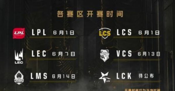 LCS(北美)赛区6月1日开赛,紧接着是LEC(欧洲)赛区6月7日开赛,在之后是VCS赛区6月13日开赛,LMS赛区6月14日开赛。