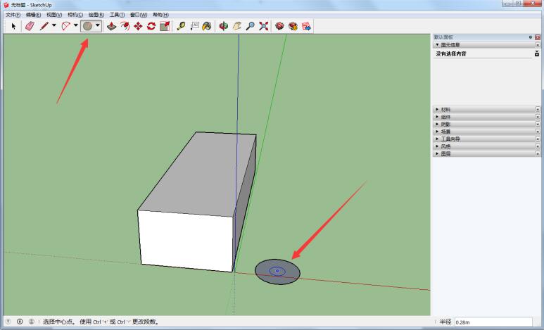 接着我们在点击形状工具,选择一个圆,在长方体的旁边画一个圆。如图操作: