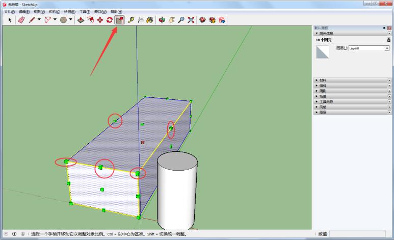 若是大家想改变你绘制的矩形三维图形,你可以先选择你要改变的模型,然后点击上面的缩放工具,这个时候选择的模型上面会出现很多绿点,在用鼠标拉伸那些绿点就可以改变它的形状了。如图操作: