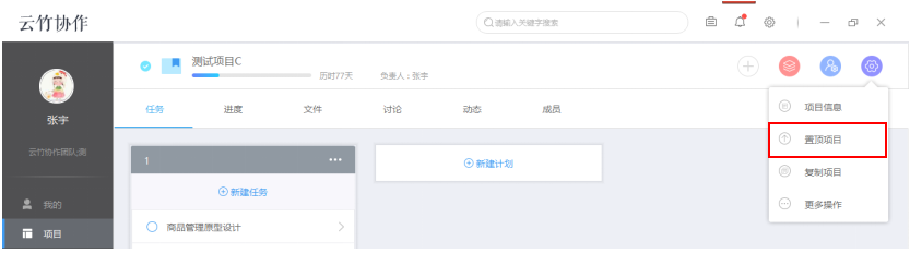 点击【置顶项目】,就可在项目列表前部分看到该项目。云竹协作允许置顶多个项目,您可将最近常操作的多个项目置顶,方便在项目列表中快速找到。若您需要取消项目置顶,同样在项目设置中选择【取消项目置顶】即可。
