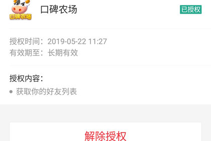 登录支付宝,点击【我的】-【设置】-【安全设置】,解除口碑农场的授权即可。