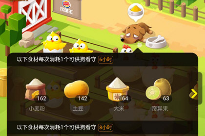 在农场的附近有一只狗,只需要消耗一个食材就可以供狗看守6或8小时,在看守期间,好友不能偷取饲料、水、食材,可以消耗一些使用率不高的食材。