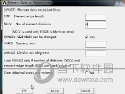 在前处理器中,单击meshing,选择第二项meshtool,会弹出窗口,点击lines,选择短边后,点击apply,在弹出的窗口中NDIV表示沿这条边划分的网格个数,这里输入2(实际中,2的输入过于小,在本文中仅为示意。一般网格划分越密,结果越准确)。