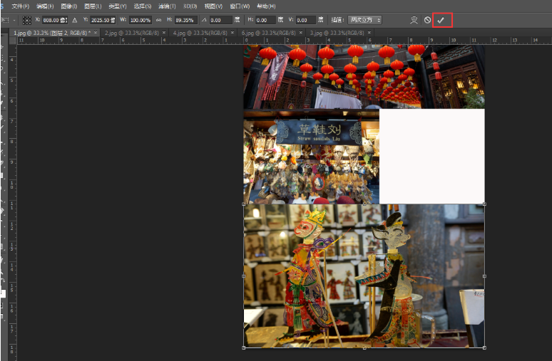 将第二张图片放入第一张图片中,如图,然后点击鼠标左键并拖动,可以用【ctel+t 】改变图片大小(注意,缩放时候按住shift等比例缩放)。