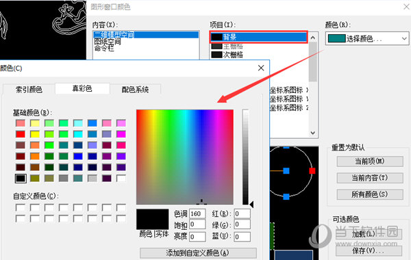 3、在【】窗口中【项目】中,选择【背景】,然后在【颜色】区域,选择你需要修改的背景颜色。