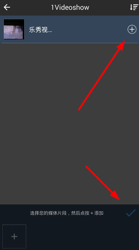 添加视频素材,点击界面右侧的“+”按钮,勾选对勾进行确认,