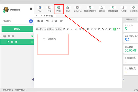 2、成功进入到此作品文章的页面,在红框标注的选框内是正文内容,如果用户想要写大纲,则可以直接点击上方的“大纲”功能选项,如下图所示: