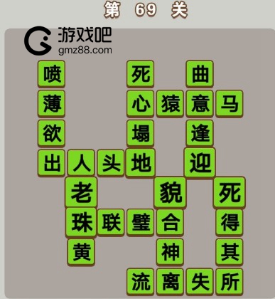 第69关答案:喷薄欲出、出人头地、人老珠黄、珠联璧合、貌合神离、妻离子散、云消雾散、死心塌地、心猿意马、曲意逢迎