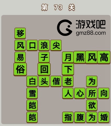 第73关答案:移风易俗、风口浪尖、浪子回头、月下老人、月黑风高、白雪皑皑、白头偕老、为所欲为、人心所向、指腹为婚。