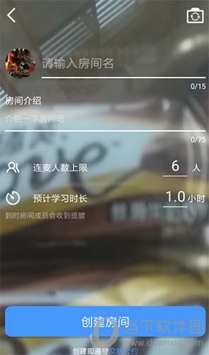 2.然后你就要输入你需要连麦的房间名称、简介内容,并且在人数上设置最多人数上限以及预计学习时长,这些通通设置好后就可以点击下方的蓝色按钮“创建房间”。