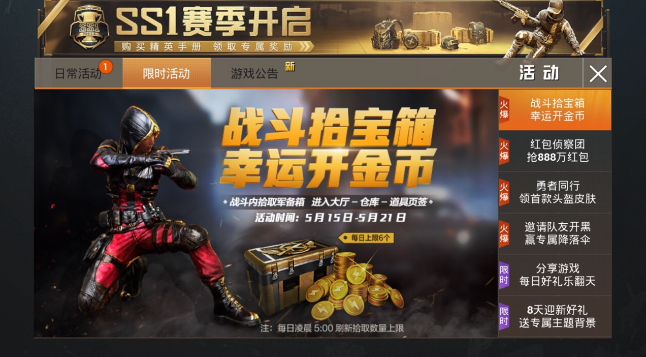 最近和平精英推出了战斗拾宝箱,幸运开金币活动,玩家们体验游戏就有机会获取精英军备箱,然后开启获取金币。