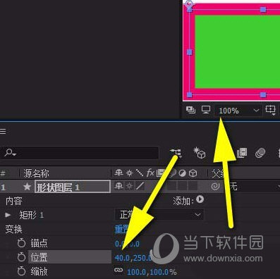 然后在各项属性中找到了变换中的位置,这个位置就是来控制图形的位置的。位置这里有两组数字,比如,现在想把矩形从右下角转到左下角,那么,就把位置左边的这一组数字减少数值。直到矩形到达窗口的左下角为止。