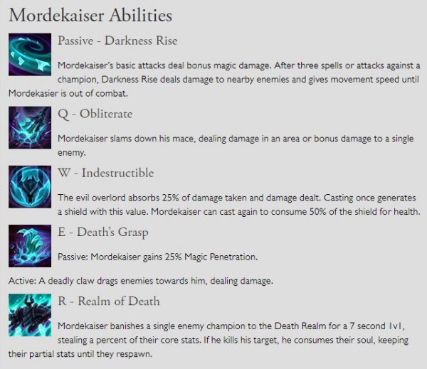 莫德凯撒的普攻造成额外的魔法伤害,在对英雄施放了三次技能或攻击后,会对附近的敌人造成伤害,并提供移动速度加成,直到莫德凯撒脱离战斗状态。